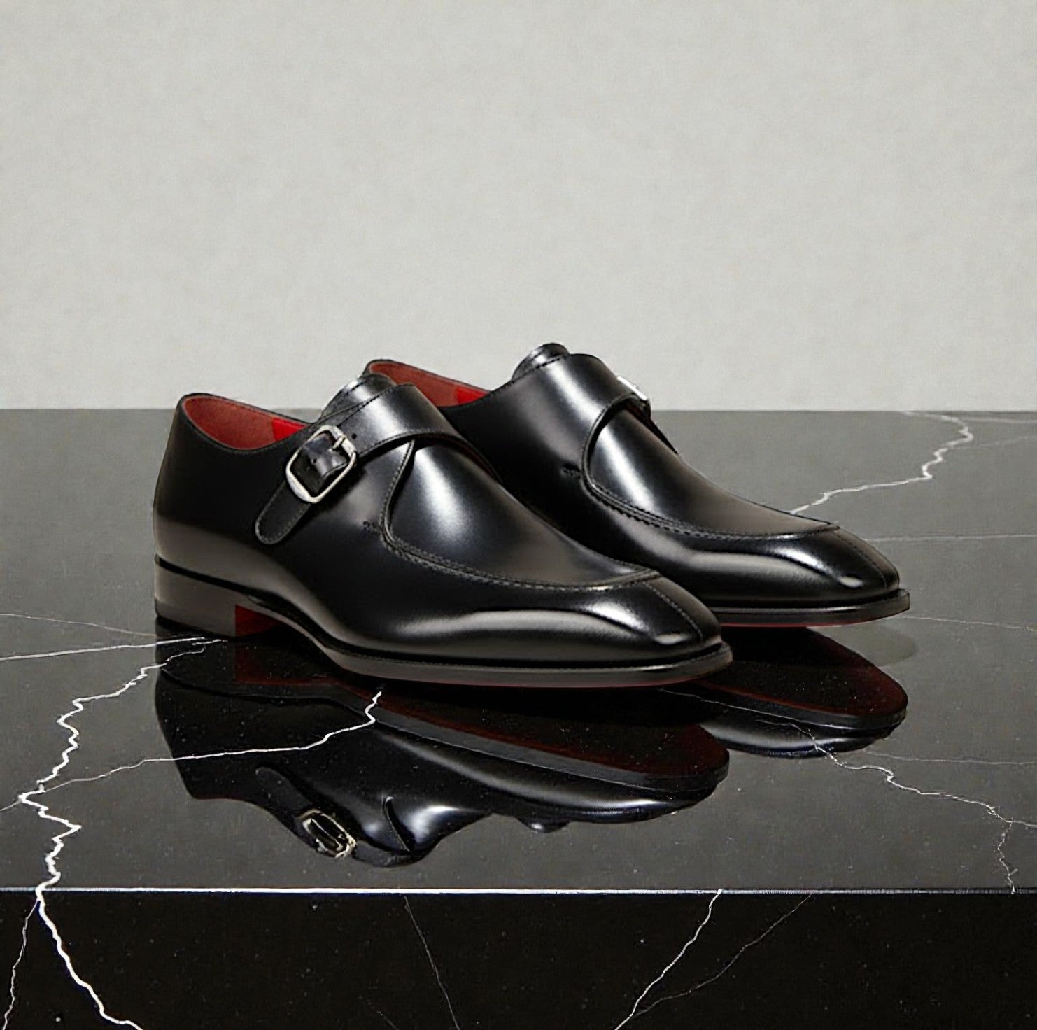 Handmade Christian Louboutin Loafer Monk Strap Leather Shoe with Red Sole & Metal Toe Taps
